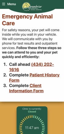 As Charlottesville’s only pet clinic dedicated exclusively to night- and weekend-emergency care, Greenbrier Emergency is an invaluable local resource for pet owners when their regular vet's office is closed. Since inception, Greenbrier has provided skilled and robust emergency veterinarian services, but their previous website was difficult for customers to understand.