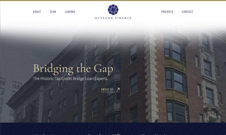 A private lender specializing in financing the restoration of historic buildings required a website restoration of its own. Featuring hundreds of project photos for renovations across the United States, Octagon Finance needed an easily navigable website design that communicated its lending prowess, national reach, and experience. Thus, our web designers produced a sleek and modern website that pays homage to the classic architectural structures this firm helps preserve.